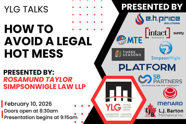 We’re excited to kick off a new year with the Young Leaders Group! Join us for the first YLG Talk on February 10 at Nerva Energy. We are going to be sharing tips on How to Avoid a Legal Hot Mess. Our speaker, construction lawyer Rosamund Taylor from SimpsonWigle Law LLP will go through some key industry areas and share what should be prioritized and/or avoided and the consequences of not following best practices. As always, there will be plenty of time for networking, refreshments and the opportunity to learn some valuable information! About our Speaker:Rosamund, who goes by Roz, is an associate at SimpsonWigle LAW specializing in construction law. She summered and articled at a national construction law firm after a career in social work and has come back to Hamilton where she is raising her (almost grown) family. She advises owners, contractors, subcontractors, and suppliers, with a strong focus on adjudication and practical dispute resolution. With over a decade of experience and deep knowledge of the construction industry, Rosamund is known for her clear, efficient approach and responsive advice. Roz is an active member of the Hamilton community, with strong involvement in both the construction sector and local organizations. Wondering what a YLG Talk is? They are educational sessions with subject-matter experts to speak on a variety of topics. Some sessions have one speaker, some have multiple or cover different topics. The Young Leaders Group organizes the events for the entire HHCA membership (not just young individuals). All YLG Talks feature a light breakfast and lots of time to network, plus they are FREE for HHCA members to attend!